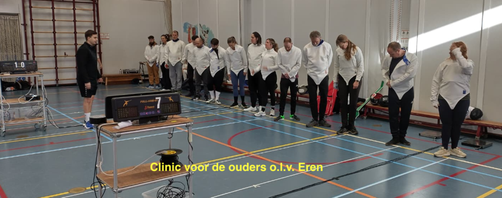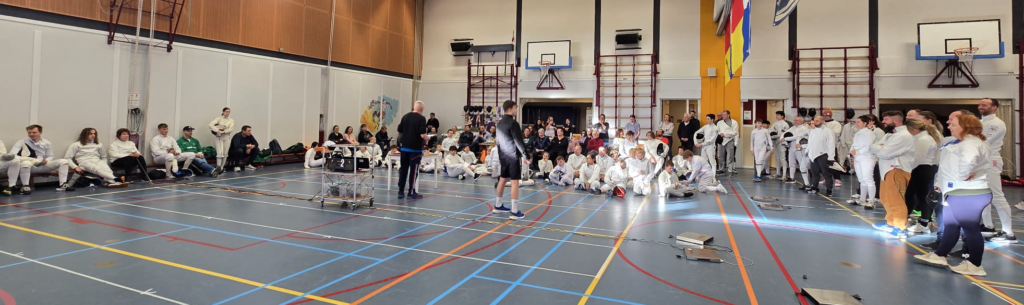 54 deelnemers en 14 ouders voor de clinic was het recept voor een geweldig schermtoernooi. Maar liefst 12 lopers konden er gebruikt worden.. De dag begon uiteraard met het klaarzetten van de toestellen en lopers door de wedstrijdploeg en de catering. Om 11.45 uur melden 14 ouders zich voor de degenclinic. Deze clinic werd op zeer deskundige en enthousiaste wijze geleid door Eren. Veel dank voor onze scheidsrechters Bianca, Frits, Antoinette, Elena, Raoul, Danica Pascal en Florentine. Zonder jullie hulp is zoiets organiseren onmogelijk. Verder dank aan de catering Maryam, Brenda (heerlijke tosti’s) en Maaike en alle ouders die na afloop hielpen om alles weer op te ruimen.